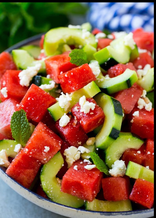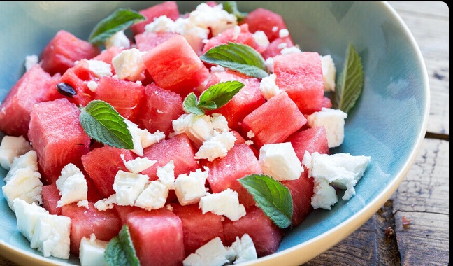 - Drizzle the dressing over the melon mixture and toss to coat. Sprinkle with feta and serve.